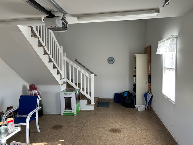 - Includes a Large finished loft above the garage that can be used for storage or as a craft area, accessible by steps that are also Epoxy Coated