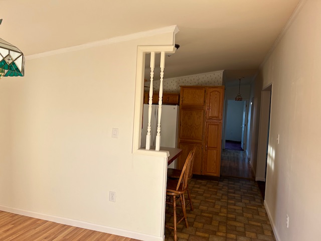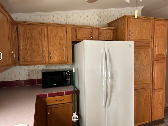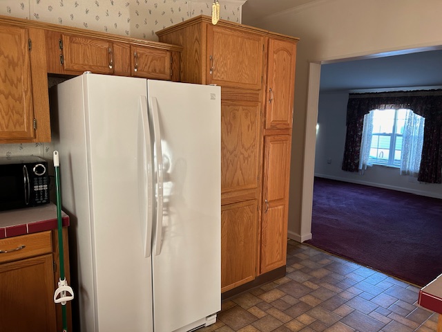 - Kitchen features ample storage space with a window over the sink, includes a refrigerator and tall Pantry Cupboard